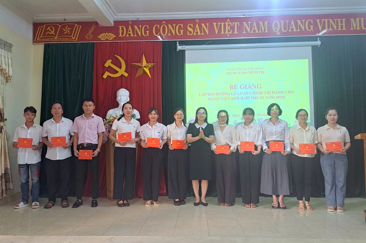 Chiều ngày 03/10/2025, Trung tâm Chính trị xã Lộc Bình tổ chức Bế giảng lớp bồi dưỡng chính trị dành cho đảng viên mới, lớp thứ 02 năm 2025. Tham gia có 70 đảng viên mới thuộc đảng bộ 7 xã gồm: Thống Nhất, Mẫu Sơn, Lợi Bác, Khuất Xá, Na Dương, Xuân Dương và xã Lộc Bình. Dự có đồng chí Vi Thị Tuyết, Ủy viên Ban Thường vụ, Trưởng Ban Xây dựng Đảng ủy xã, Giám đốc Trung tâm chính trị xã Lộc Bình; đồng Chí Lê Văn Tùng, Ủy viên Ban chấp hành, Phó Giám đốc Trung tâm chính trị xã Lộc Bình; đồng chí Hoàng Thị Thúy, Phó Chánh Văn phòng Đảng ủy xã Lộc Bình.