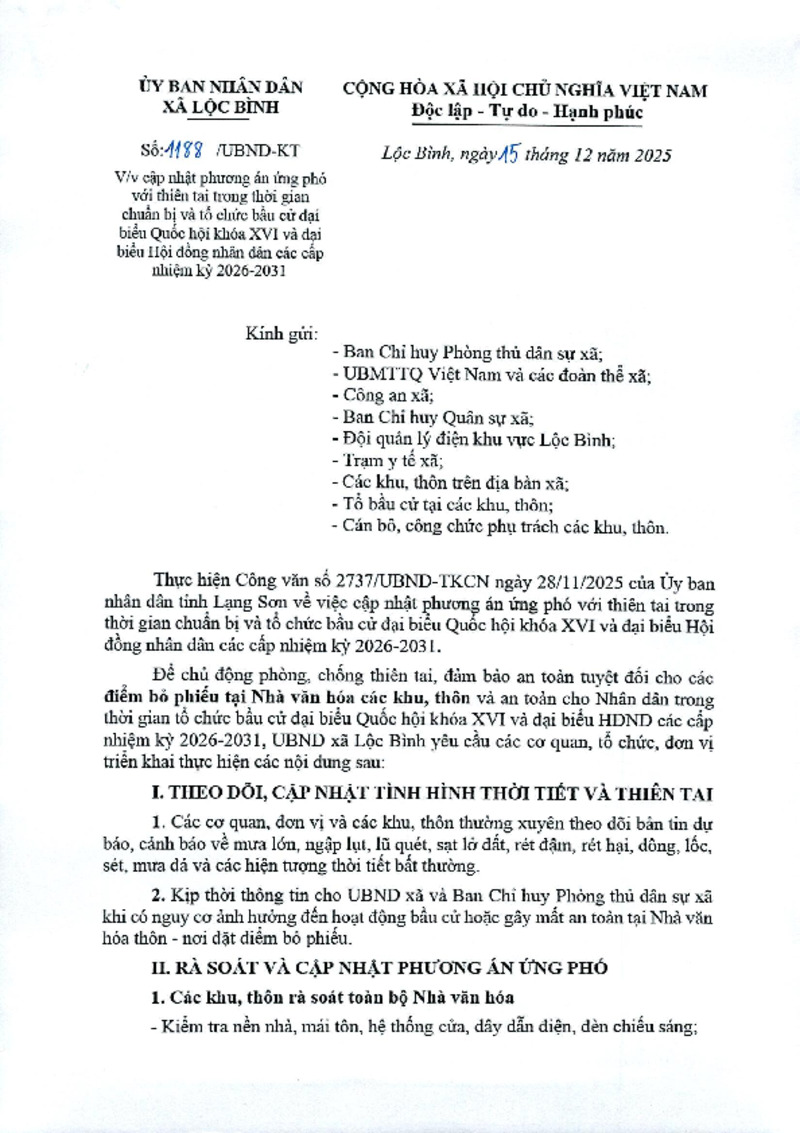 | Tiêu đề văn bản | CÔNG VĂN Về việc cập nhật phương án ứng phó với thiên tai trong thời gian chuẩn bị và tổ chức bầu cử Đại biểu Quốc hội khóa XVI và đại biểu hội đồng nhân dân các cấp nhiệm kỳ 2026 - 2031 | ||