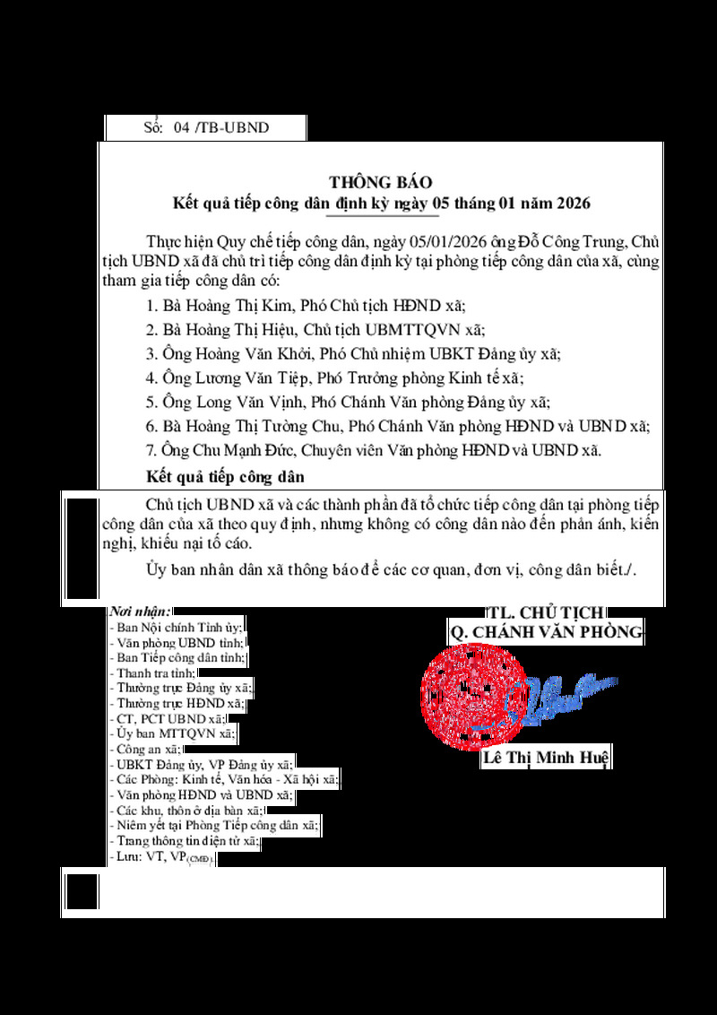 | Tiêu đề văn bản | THÔNG BÁO Kết quả tiếp công dân định kỳ ngày 05 tháng 01 năm 2026 | ||