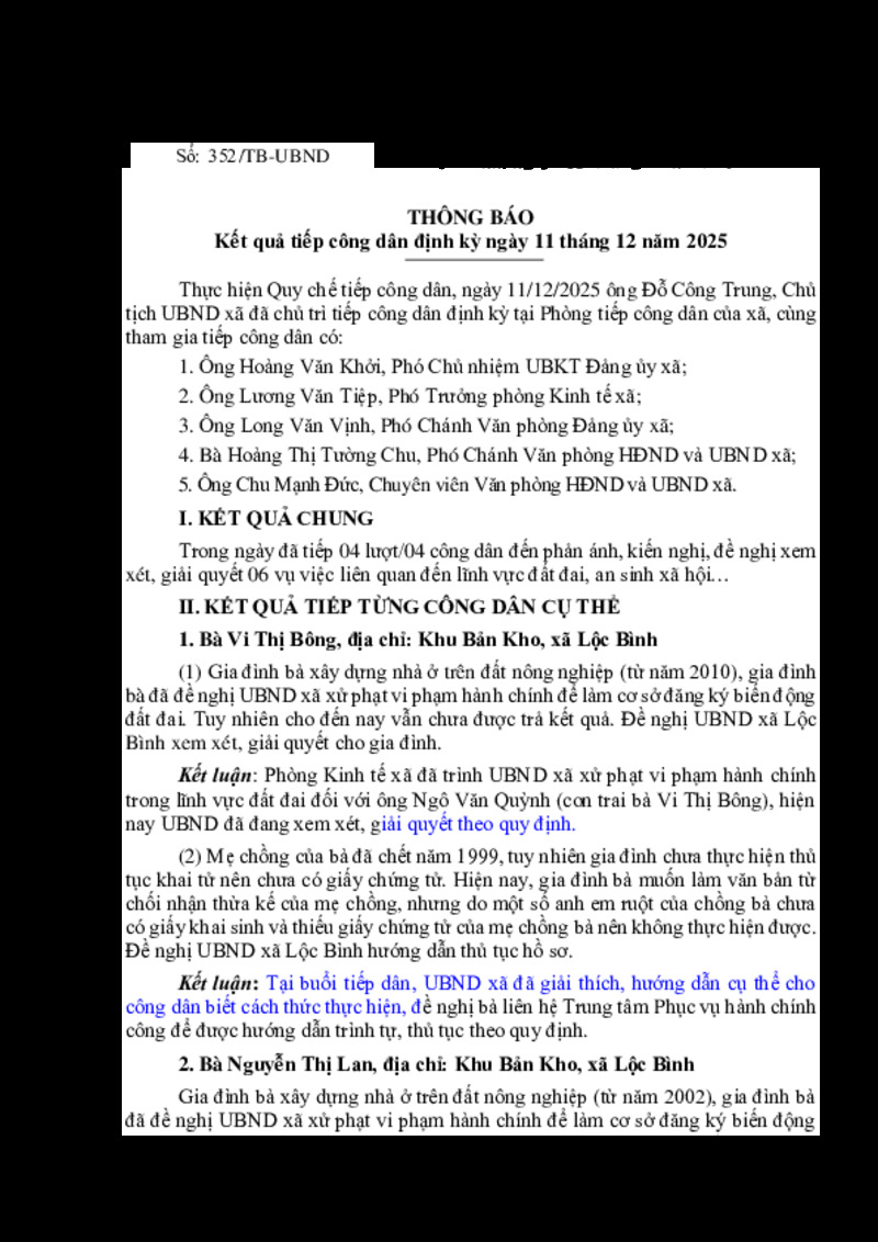 | Tiêu đề văn bản | THÔNG BÁO Kết quả tiếp công dân định kỳ ngày 11 tháng 12 năm 2025 | ||