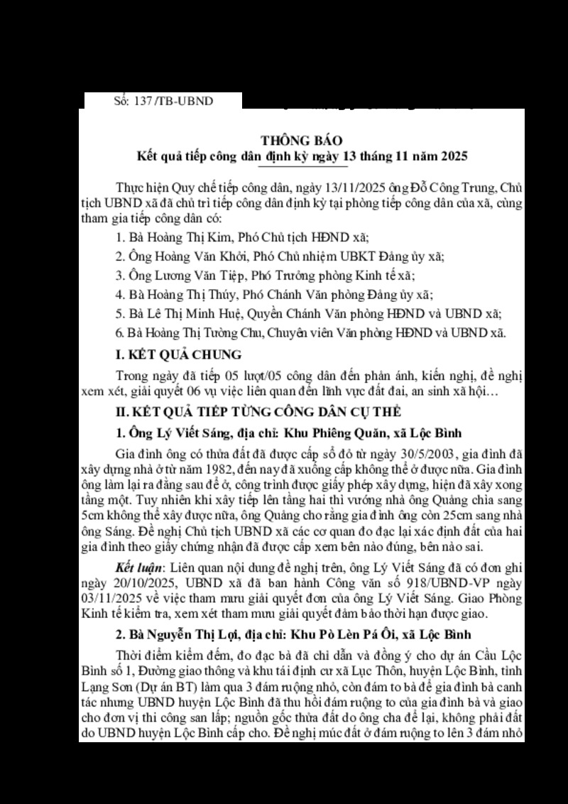 | Tiêu đề văn bản | THÔNG BÁO Kết quả tiếp công dân định kỳ ngày 13 tháng 11 năm 2025 | ||