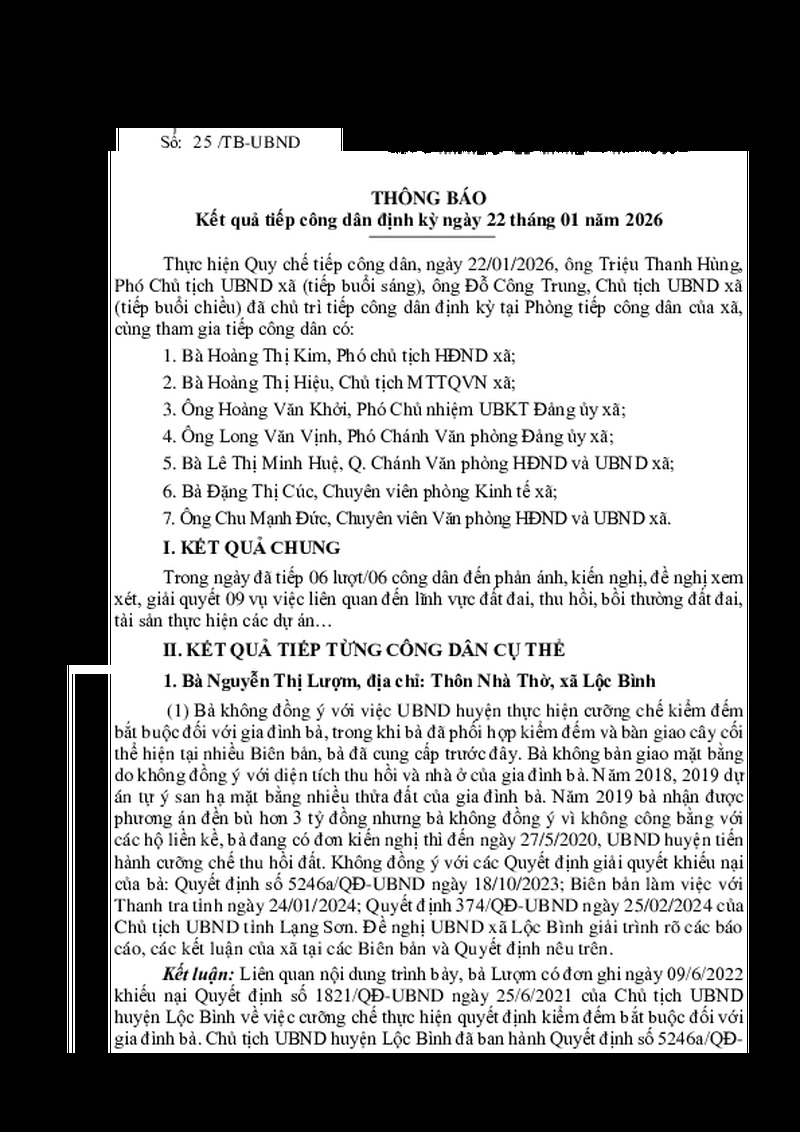 | Tiêu đề văn bản | THÔNG BÁO Kết quả tiếp công dân định kỳ ngày 22 tháng 01 năm 2026 | ||