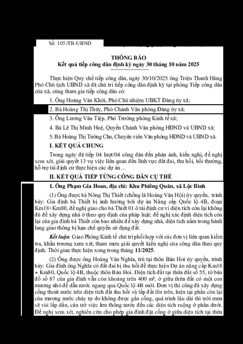 | Tiêu đề văn bản | THÔNG BÁO Kết quả tiếp công dân định kỳ ngày 30 tháng 10 năm 2025 | ||