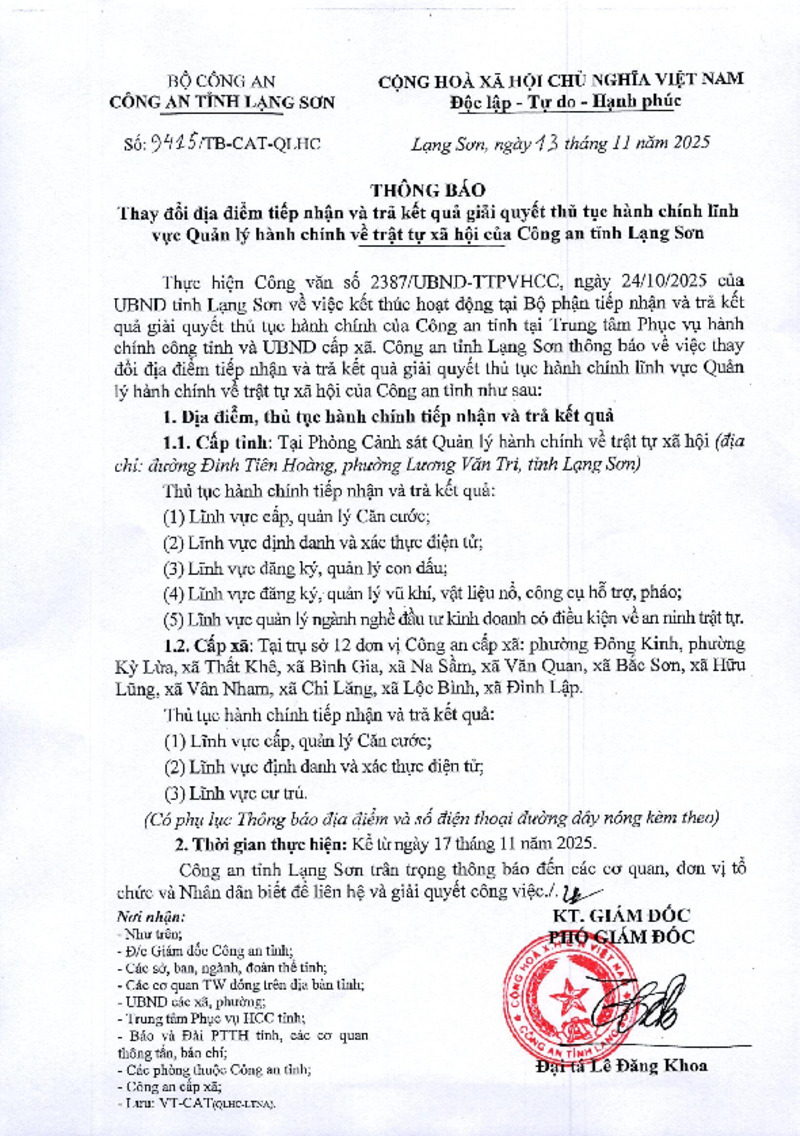 | Tiêu đề văn bản | THÔNG BÁO Thay đổi địa điểm tiếp nhận và trả kết quả giải quyết thủ tục hành chính lĩnh vực Quản lý hành chính về trật tự xã hội của Công an tỉnh Lạng Sơn | ||