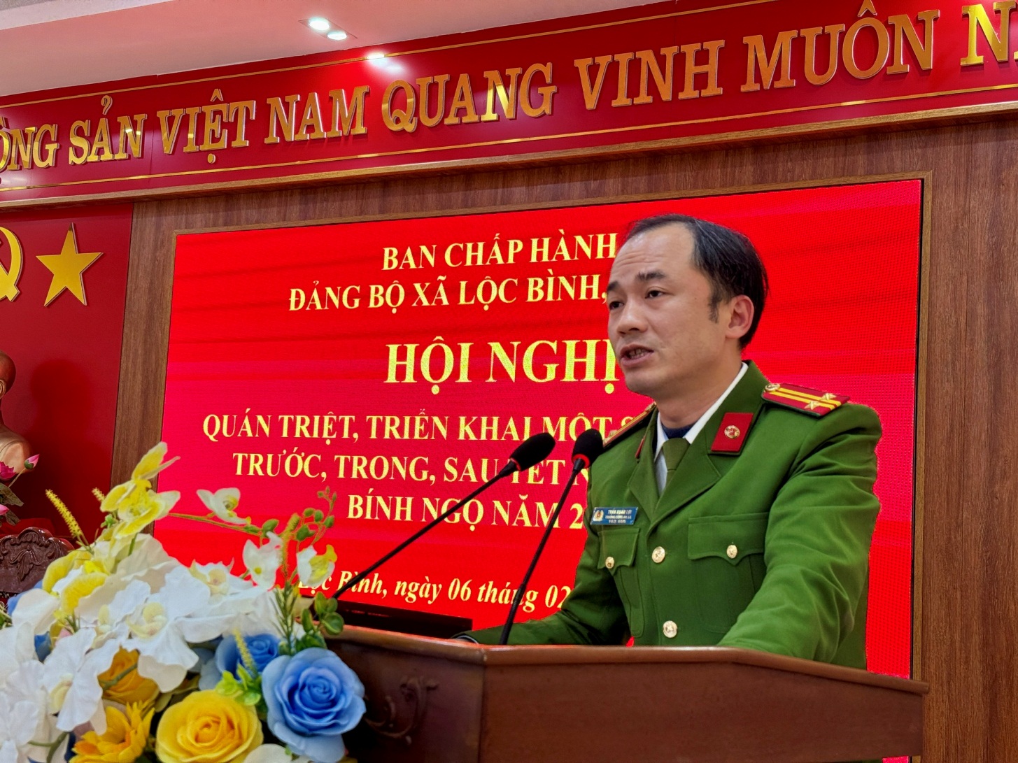 Tại hội nghị, đồng chí trung tá Trần Văn Lợi, Trưởng Công an xã báo cáo nhanh tình hình an ninh chính trị, trật tự an toàn xã hội và trật tự an toàn giao thông trên địa bàn xã trong thời gian qua; đồng thời quán triệt, triển khai một số nội dung về công tác đảm bảo ANTT trước, trong và sau Tết Nguyên đán Bính Ngọ năm 2026 và phục vụ cuộc bầu cử đại biểu Quốc hội khoá XVI và đại biểu HĐND các cấp nhiệm kỳ 2026 - 2031. Trong đó, lực lượng Công an xã sẽ tăng cường nắm chắc tình hình địa bàn, chủ động phòng ngừa, đấu tranh với các loại tội phạm; đẩy mạnh tuần tra, kiểm soát, bảo đảm trật tự an toàn giao thông; tập trung phòng, chống các hành vi buôn bán, vận chuyển, tàng trữ, sử dụng pháo nổ trái phép, kịp thời phát hiện, xử lý các vụ việc phát sinh, không để hình thành điểm nóng, góp phần giữ vững ổn định an ninh chính trị, trật tự an toàn xã hội trên địa bàn xã.
