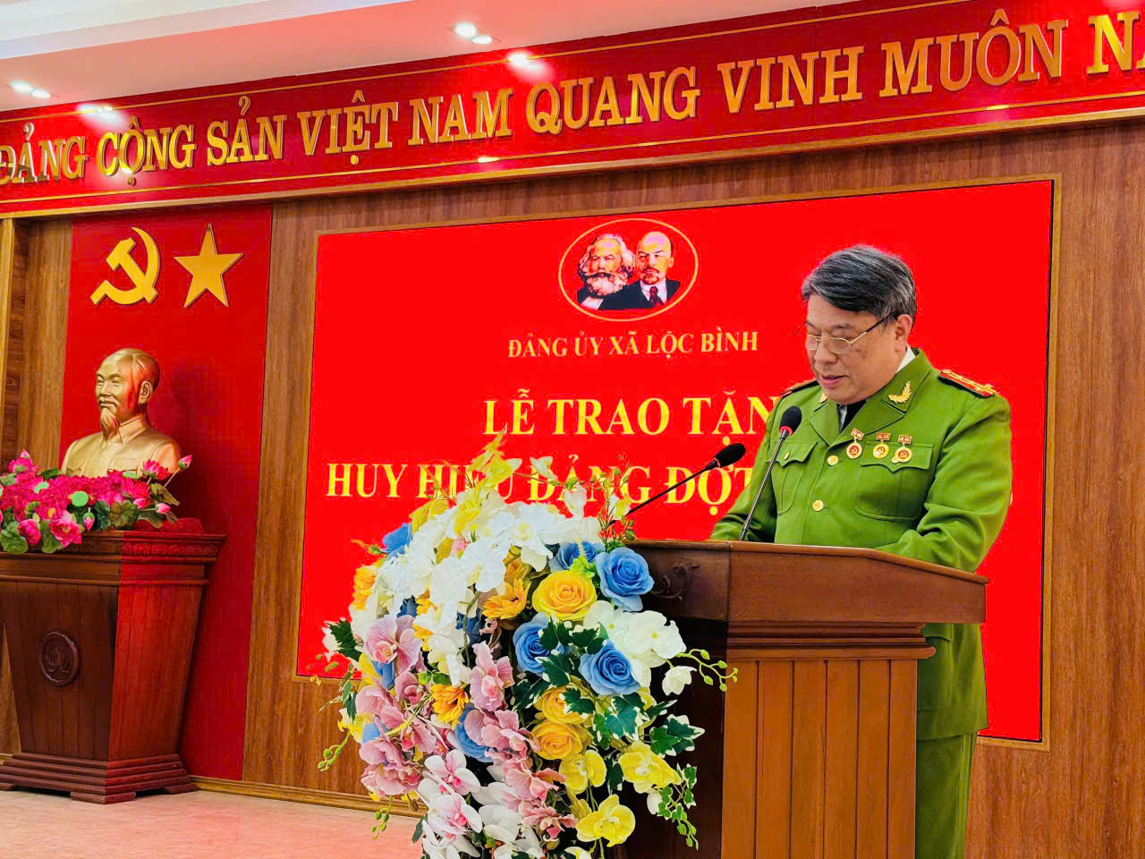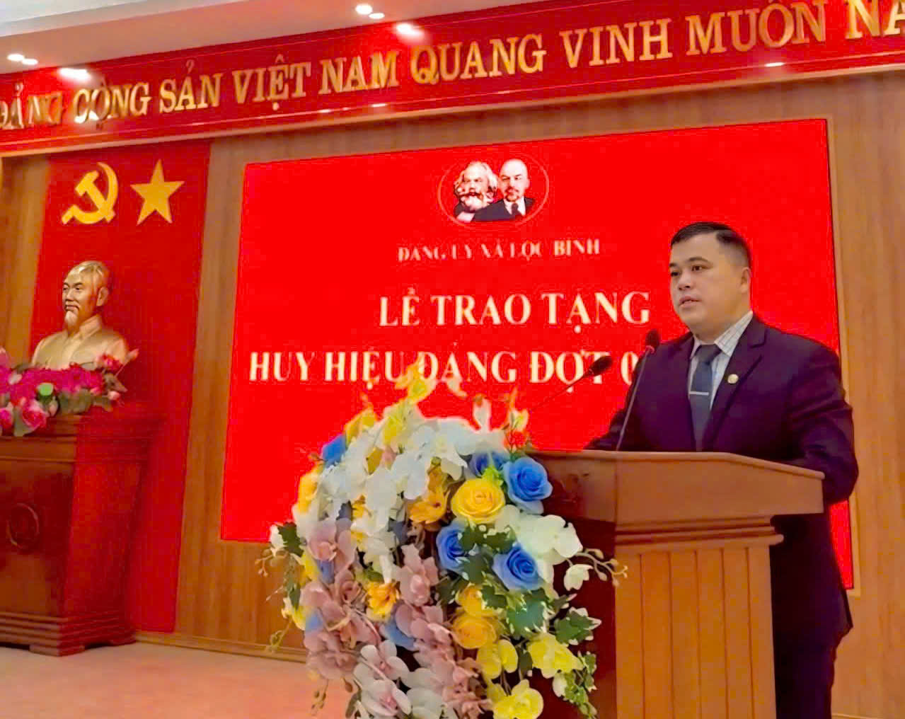 Phát biểu tại buổi lễ, đồng chí Lăng Văn Chí, Phó Bí thư Thường trực Đảng ủy xã, chúc mừng và trân trọng cảm ơn những cống hiến, đóng góp của các đảng viên đã góp phần vào lịch sử 96 năm vẻ vang của Đảng ta, vào sự nghiệp đấu tranh giành độc lập dân tộc, bảo vệ và xây dựng Tổ quốc. Qua đó mong muốn, thời gian tới, các đồng chí đảng viên được nhận Huy hiệu Đảng hôm nay, tiếp tục giữ gìn phẩm chất chính trị, đạo đức cách mạng, là những tấm gương sáng cho thế hệ trẻ học tập, noi theo, xứng đáng với phần thưởng cao quý được Đảng trao tặng; tiếp tục đồng hành, chia sẻ kinh nghiệm, trí tuệ, góp phần xây dựng Đảng và các phong trào tại địa phương, góp phần xây dựng xã Lộc Bình ngày càng phát triển nhanh và bền vững. Trong không khí chuẩn bị đón Tết Nguyên đán Bính Ngọ 2026, đồng chí chúc các đảng viên cùng gia đình năm mới mạnh khỏe, hạnh phúc, an khang thịnh vượng.