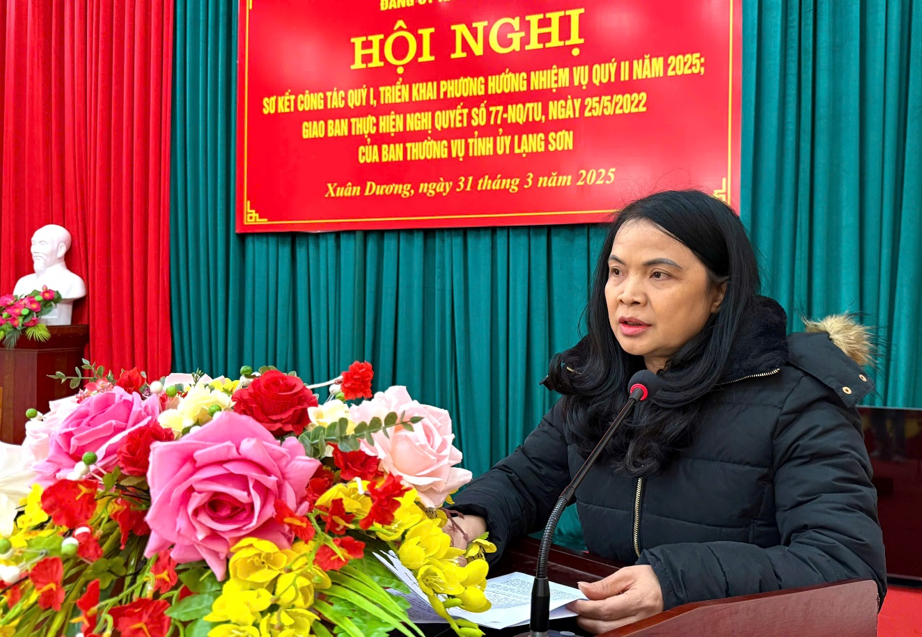 Chiều 31/3, Đảng ủy xã Xuân Dương tổ chức Hội nghị sơ kết công tác quý I, triển khai phương hướng nhiệm vụ quý II năm 2025; Giao ban thực hiện Nghị quyết số 77-NQ/TU, ngày 25/5/2022 của Ban Thường vụ Tỉnh ủy Lạng Sơn. Dự hội nghị có đồng chí Hoàng Thị Kim Vân, Trưởng Ban Văn hóa – Xã hội HĐND tỉnh; đồng chí Đỗ Công Trung, Phó Chủ tịch HĐND huyện; lãnh đạo Ban Tổ chức Huyện ủy.