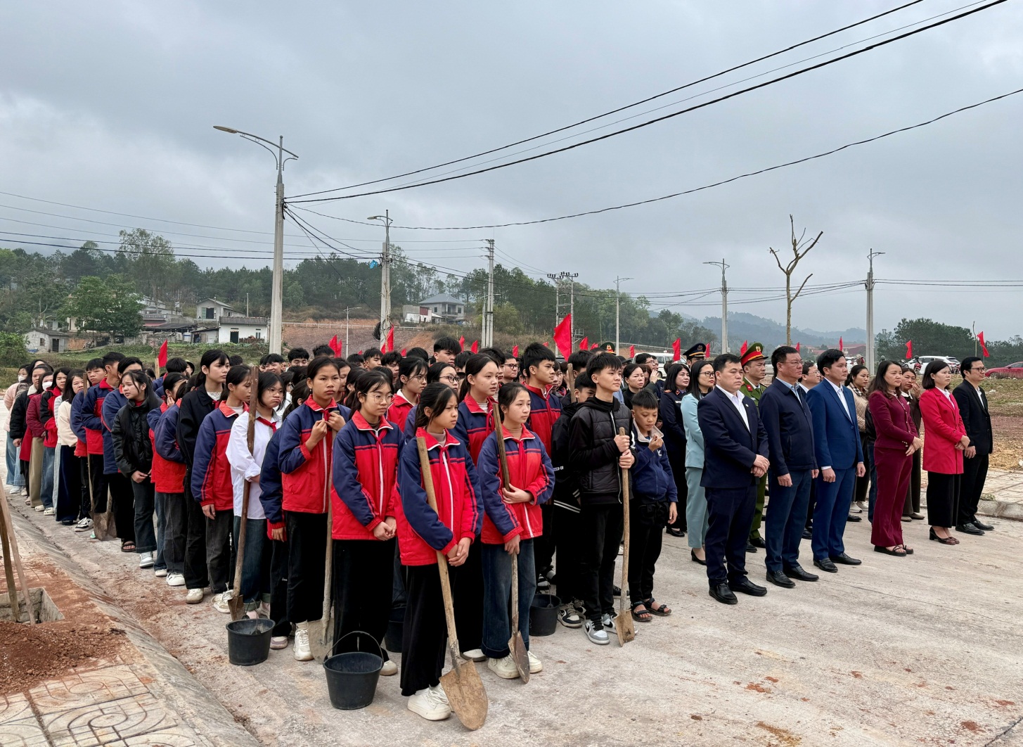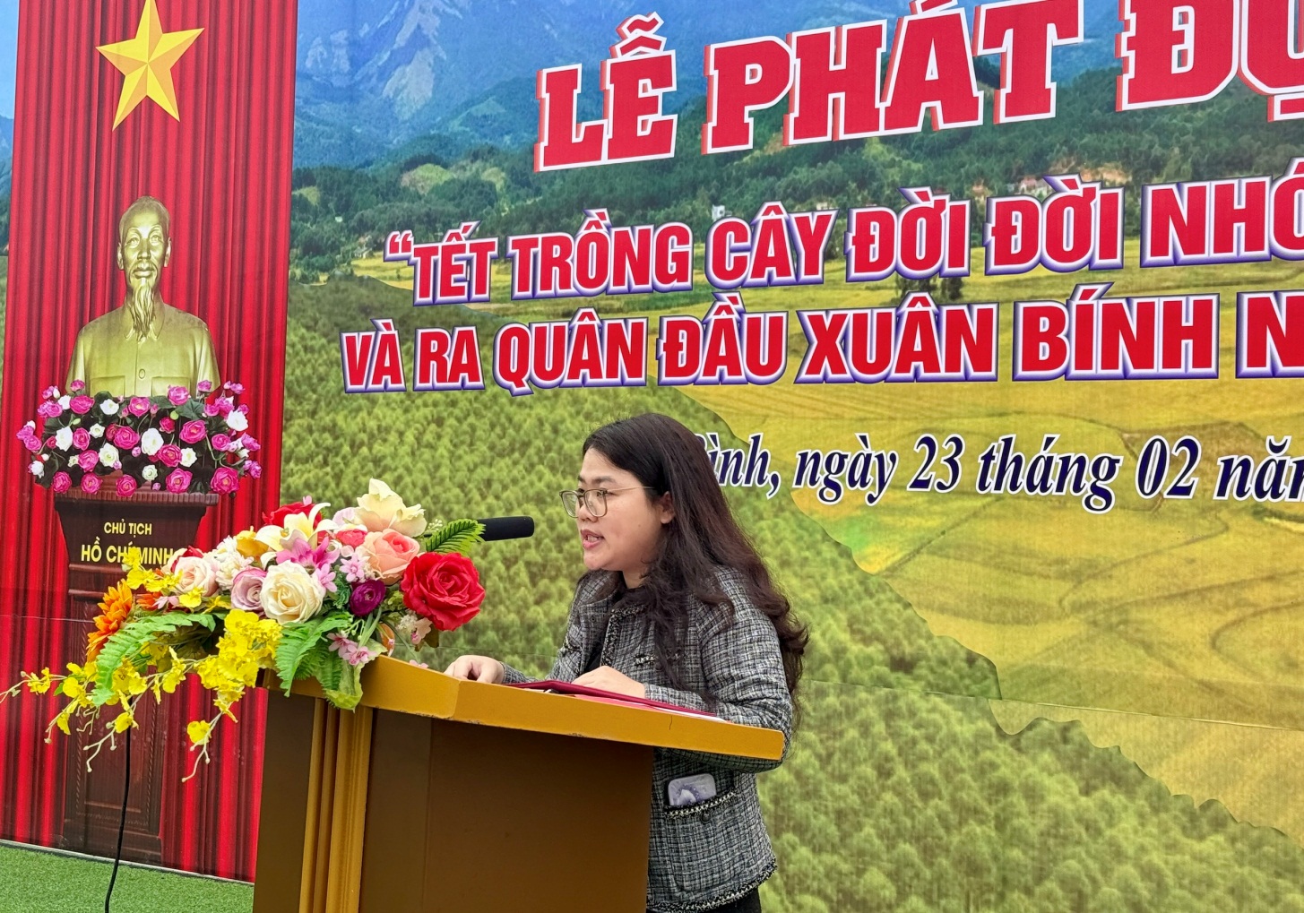 Phát biểu tại buổi lễ, đồng chí Vi Thị Phương Quỳnh, Phó Chủ tịch UBND xã nhấn mạnh: Tổ chức “Tết trồng cây đời đời nhớ ơn Bác Hồ” đã thực sự mang lại lợi ích to lớn và trở thành một tập quán tốt đẹp của nhân dân ta trong những dịp tết đến xuân về. Việc trồng cây, trồng rừng đã góp phần quan trọng trong việc chủ động phòng, chống thiên tai, điều hòa khí hậu, cải thiện môi trường sinh thái, làm đẹp thêm cảnh quan thiên nhiên, phát triển kinh tế xã – hội của quê hương, đất nước, nâng cao đời sống tinh thần của nhân dân. Lễ phát động năm nay được tổ chức tại khu tái định cư thôn Pò Khoang, thuộc dự án cải tạo nâng cấp Quốc lộ 4B, với tổng diện tích 12 ha, hiện nay đã được đầu tư cơ sở hạ tầng quy mô 3,2 ha, bố trí tái định cư cho 40 hộ gia đình bị ảnh hưởng bởi các dự án trên địa bàn xã đủ điều kiện để giao đất làm nhà ở, sớm ổn định cuộc sống. Đồng chí đề nghị các cơ quan, đơn vị và toàn thể Nhân dân trên địa bàn xã thực hiện việc trồng cây phải đi đôi với chăm sóc bảo vệ, bảo đảm tỷ lệ sống cao nhất tránh tình trạng hình thức và gắn với đợt ra quân làm giao thông nông thôn, khơi thông thủy lợi vệ sinh môi trường theo kế hoạch.