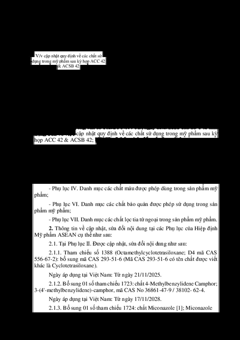 | Tiêu đề văn bản | CÔNG VĂN Về việc cập nhật quy định về các chất sử dụng trong mỹ phẩm sau kỳ họp ACC 42 & ACSB 42 | ||