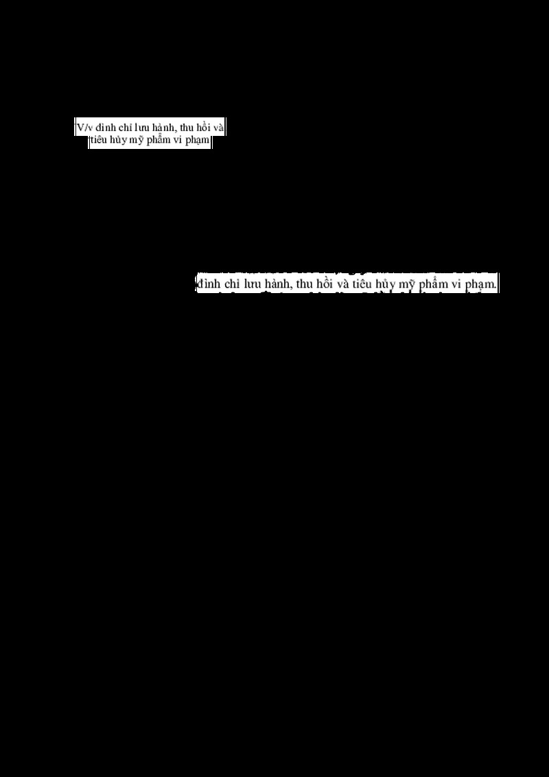 | Tiêu đề văn bản | CÔNG VĂN Về việc đình chỉ lưu hành, thu hồi và tiêu hủy mỹ phẩm vi phạm | ||