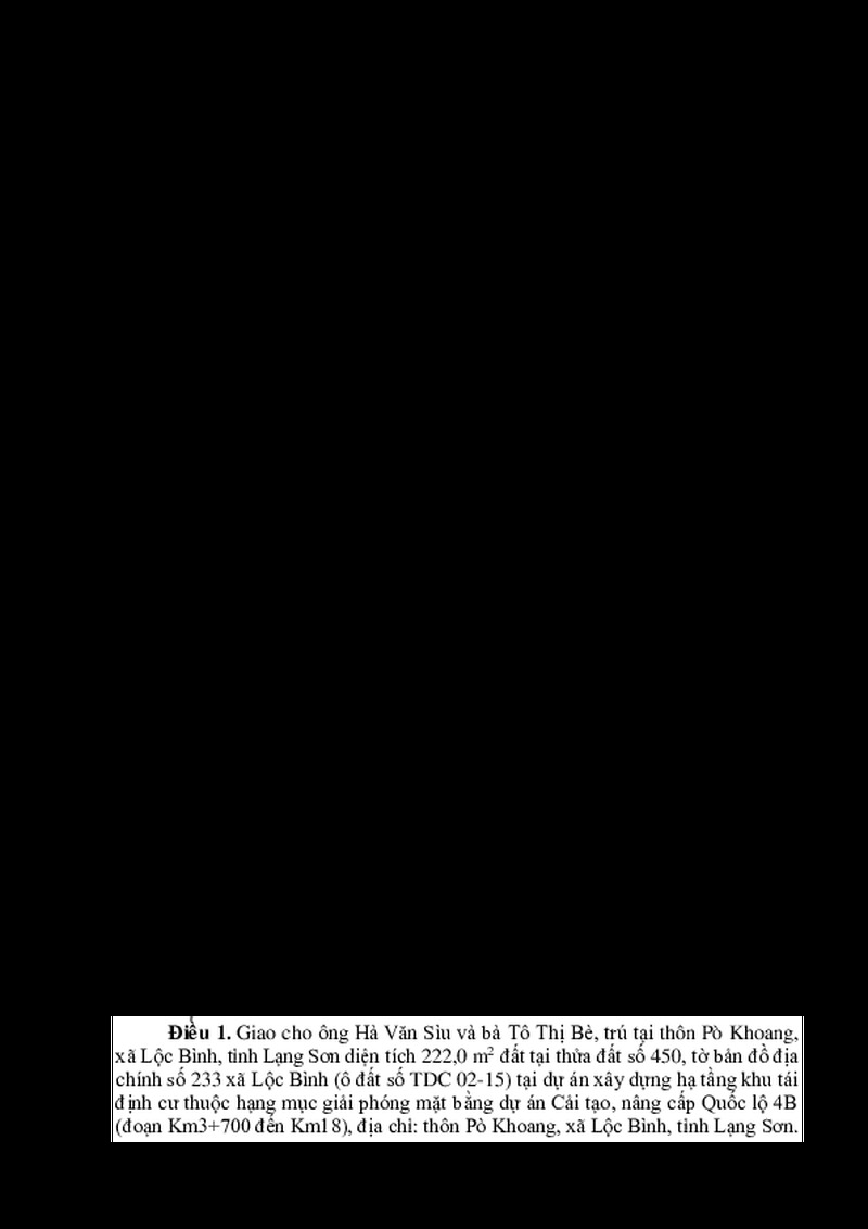 | Tiêu đề văn bản | QUYẾT ĐỊNH Về việc giao đất tái định cư cho ông Hà Văn Sìu và bà Tô Thị Bè | ||