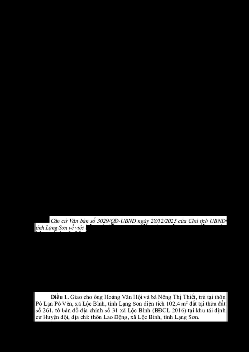 | Tiêu đề văn bản | QUYẾT ĐỊNH Về việc giao đất tái định cư cho ông Hoàng Văn Hội và bà Nông Thị Thiết | ||